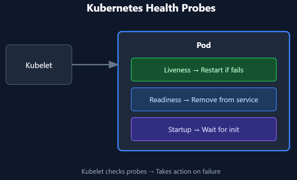 Startup Probe: Answers “Has this application finished initializing?” This probe runs only during startup, and once it succeeds, liveness and readiness probes take over. Critical for applications with slow startup times—without this, aggressive liveness probes would kill containers before they finish initializing.