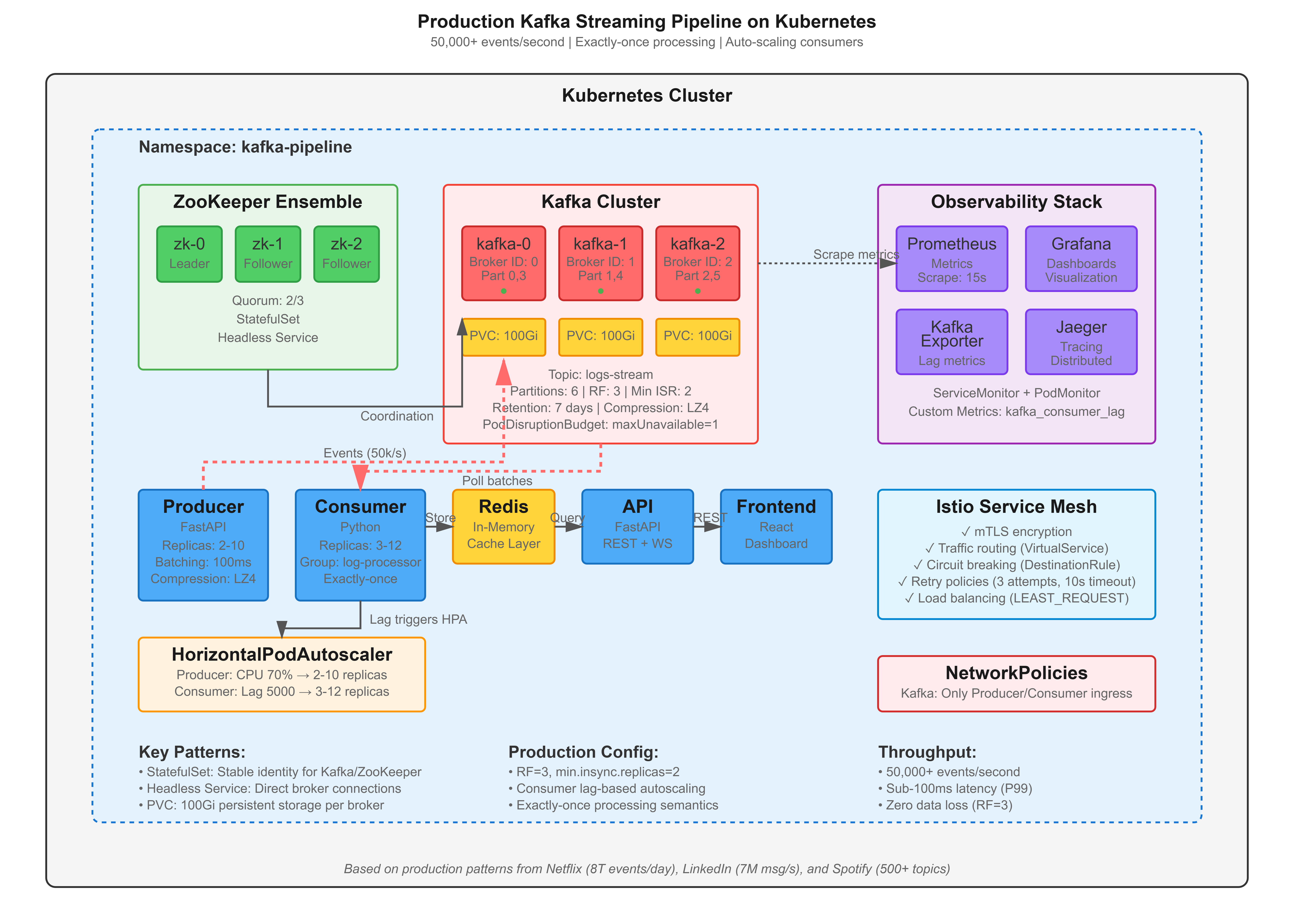 Production Kafka Cluster: 3-broker Kafka ensemble with ZooKeeper coordination, handling 50,000+ events/second