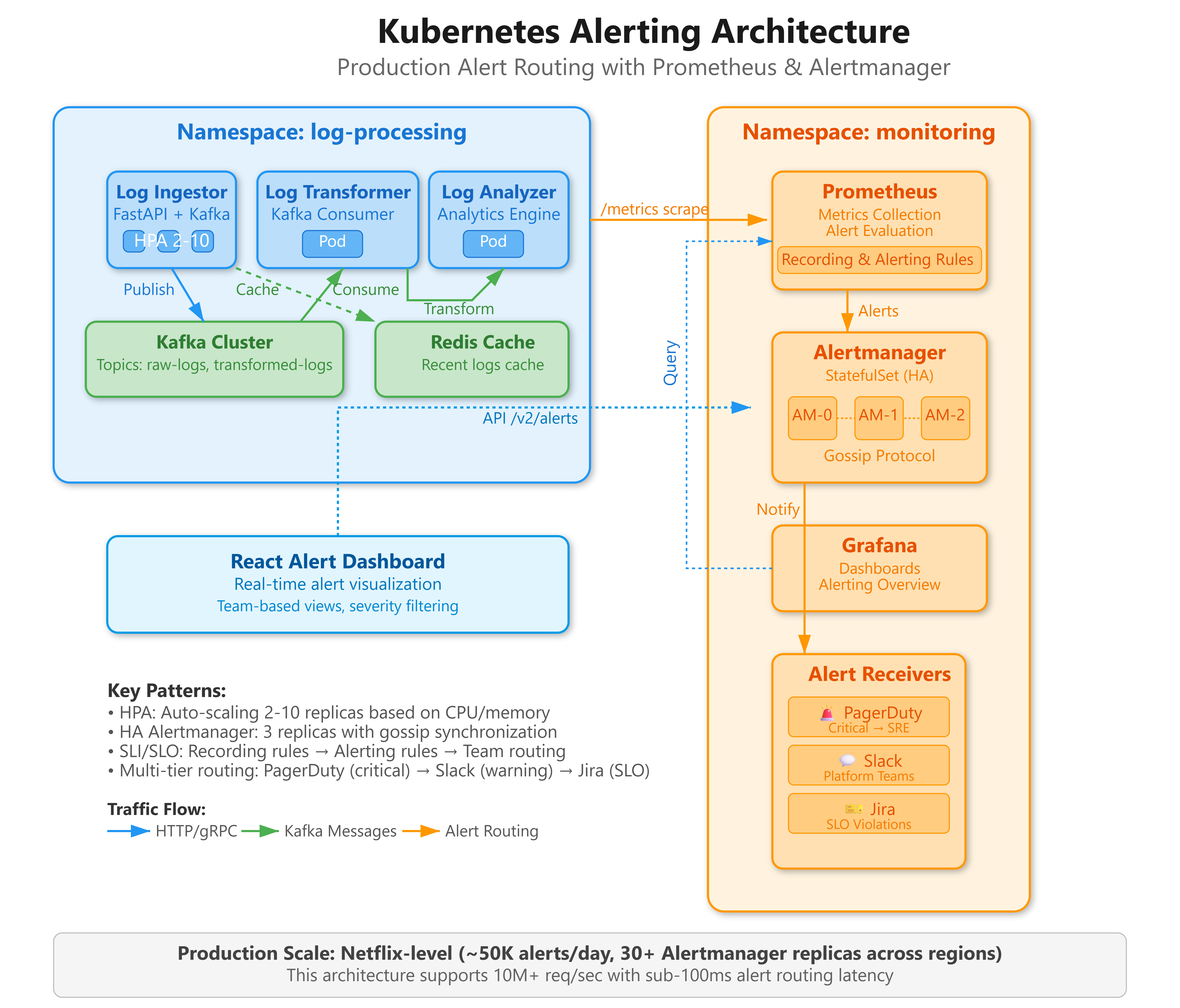 The architectural insight most engineers miss: alerting isn’t a monitoring addon—it’s a distributed system problem. At scale, Alertmanager instances themselves require high availability, state synchronization via gossip protocols, and careful capacity planning. Netflix runs 30+ Alertmanager replicas across regions, each handling 50,000 active alerts with sub-100ms routing latency.